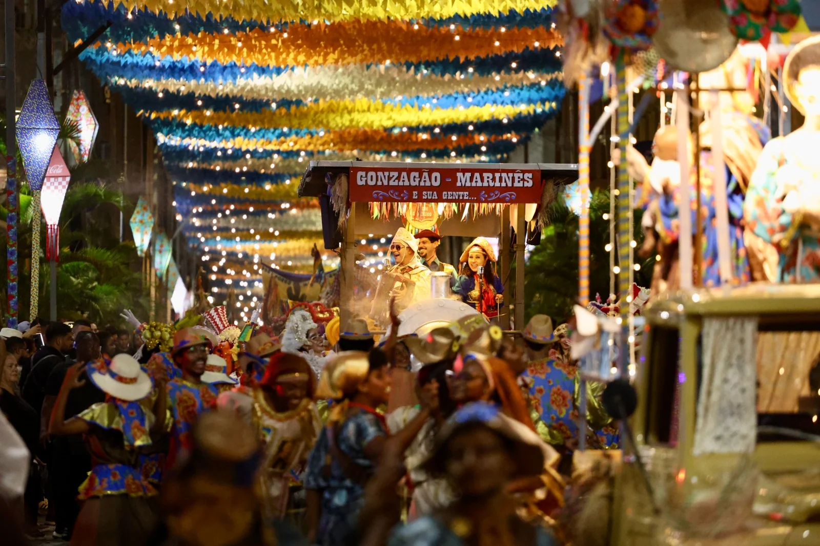 Na abertura, o público acompanhou um cortejo que saiu das imediações do Hotel Fera Palace em direção à Praça Municipal, com alas que homenagearam as tradições juninas, como as quadrilhas e as novenas dedicadas a Santo Antônio, uma das figuras centrais das festas no Nordeste.