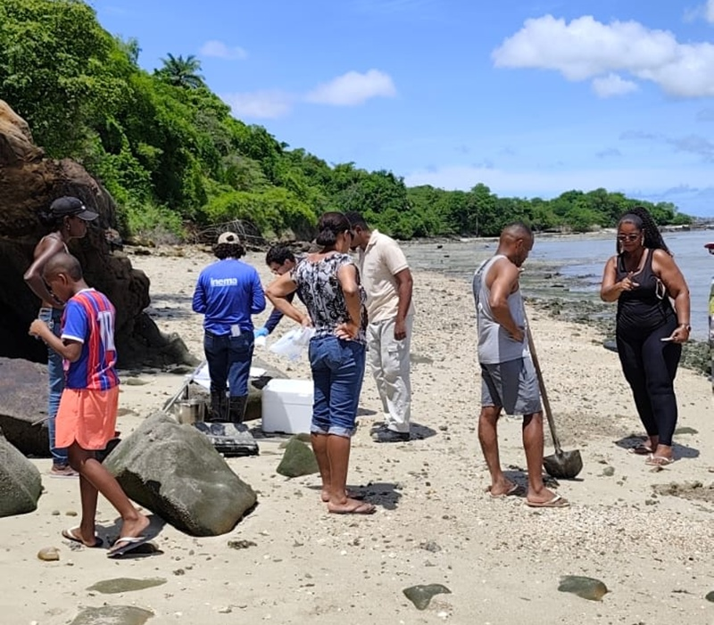 Técnicos do Instituto do Meio Ambiente e Recursos Hídricos (Inema) retornaram à praia de São Tomé de Paripe, no Subúrbio de Salvador, nesta quinta-feira (2). Novas amostras de produtos que brotam da areia e se misturam com a água do mar foram coletadas.
