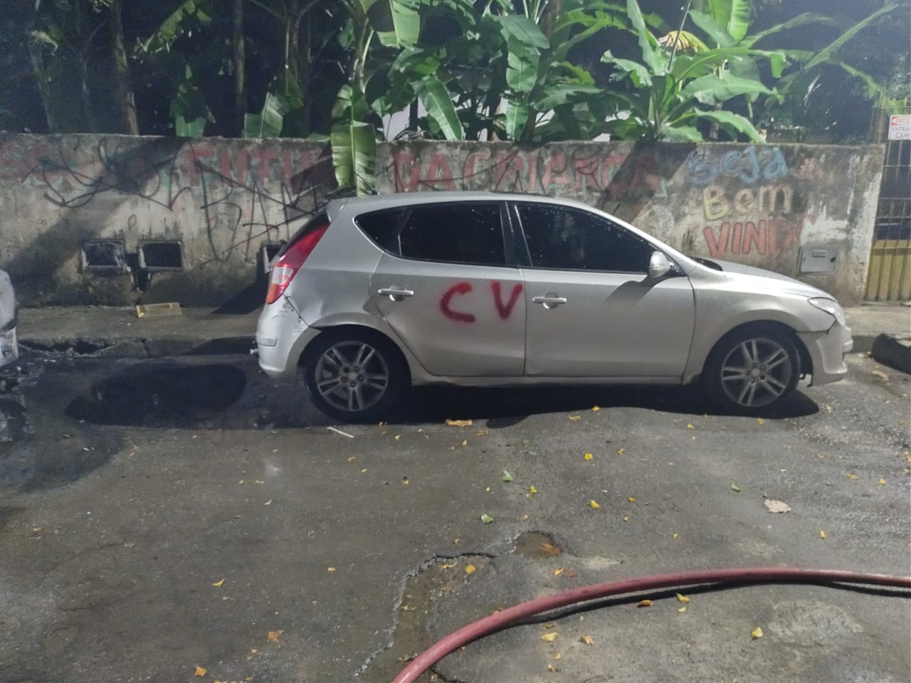 Os automóveis também foram pichados com a sigla da facção CV. O Corpo de Bombeiros foi acionado para debelar as chamas, mas os carros ficaram destruídos.